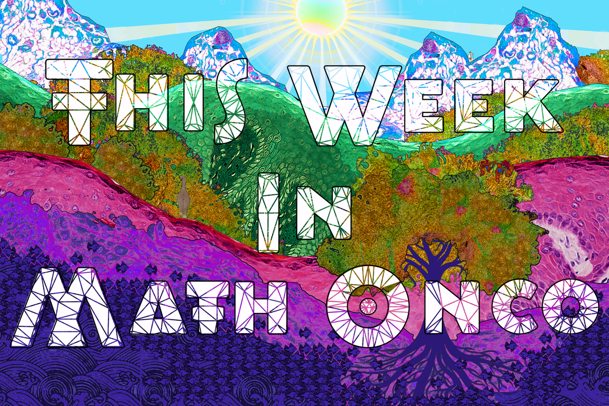 Issue 232: Next week IMO will run its 10th annual workshop. This workshop is designed to motivate and facilitate a hands-on modeling experience focused on different aspects of cancer progression and treatment. This year our theme is "Cancer Communities". In this artwork we have tried to capture this theme by integrating elements of community (ranging from tumor histology, to fish to circos plots, and even a cat if you can spot it) into a mountainous landscape, reflecting the similarities between the ecosystems around us and those within patients afflicted by the disease. To learn more, check out the webpage and follow the action on Twitter next week (#MoffittIMO)