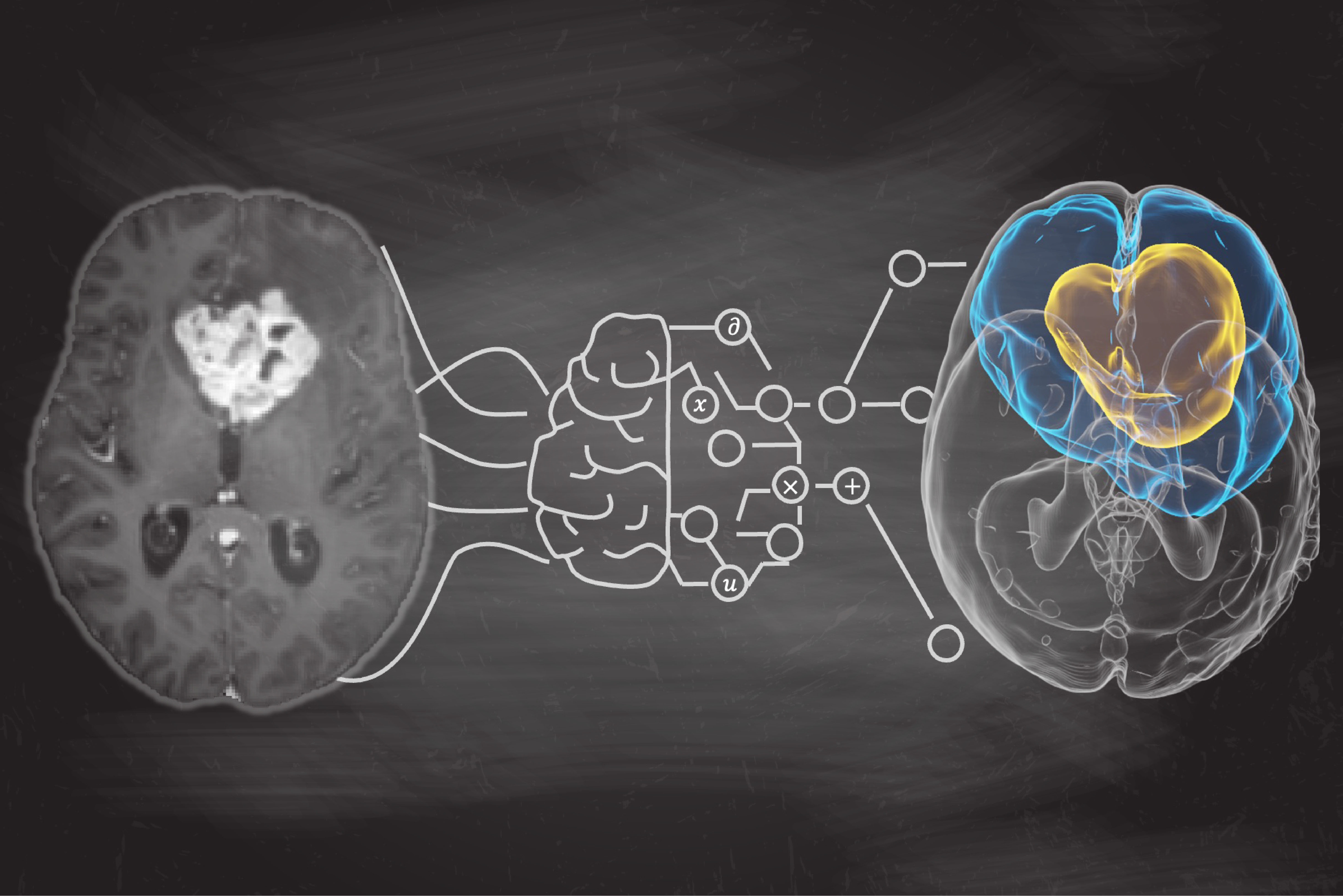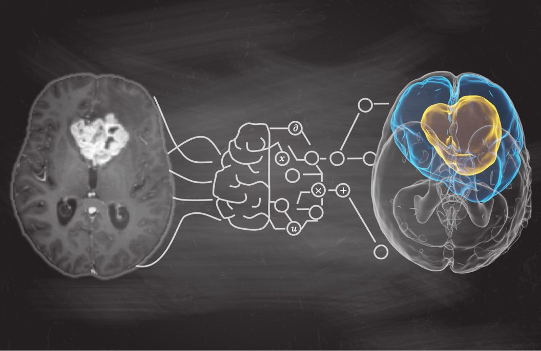 Issue 323: This artwork represents the integration of multimodal imaging, mathematical modeling, and physics-informed machine learning to create personalized digital twins for glioblastoma (GBM) infiltration predictions. On the left, a brain MRI showcases the tumor region, representing real-world medical imaging data. The central schematic illustrates a physics-informed neural network, a machine learning framework that embeds mathematical model to predict tumor growth and infiltration dynamics. The neural network integrates patient-specific data with reaction-diffusion equations, capturing both spatial and temporal dynamics of GBM growth. On the right, a 3D visualization combines predicted tumor regions (yellow and blue) and the brain's anatomy (gray), highlighting the potential of digital twins for personalized predictions. This fusion of physics, machine learning, and multimodal data offers a novel framework for understanding GBM progression, advancing patient-specific treatment strategies. The image emphasizes the synergy between computational methods and clinical data, symbolizing a step toward precision oncology.