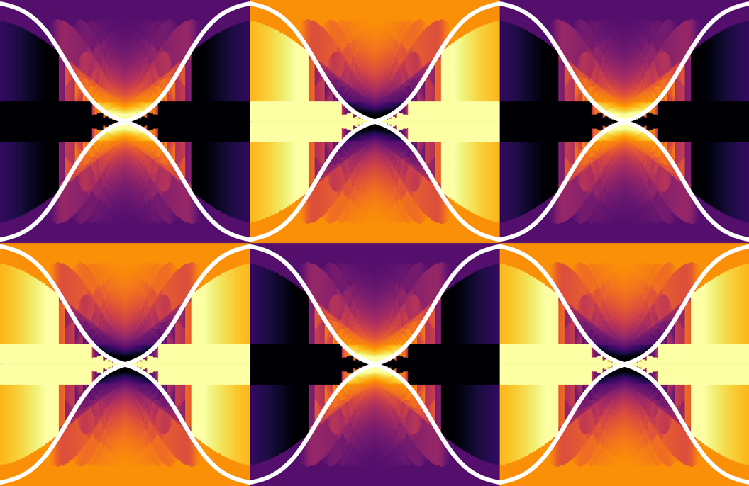 Issue 328: When implementing Adaptive Therapy (AT) treatment schedules clinically, patients are monitored (and treatment schedules updated) at discrete time intervals. This leads to a trade-off; more frequent clinical appointments allow greater control of the tumor at a higher average size (leading to longer time to progression, or TTP), but are more costly and logistically challenging to implement. We can derive the optimal threshold size for treatment to be used in an AT protocol, and plot this in white over different time intervals between appointments. This is superimposed over the TTP for all different treatment protocols (given by the coloured background) - super-critical protocols on one side of the optimal line leads to chaotic outcomes while sub-optimal protocols achieve a lower TTP. This pattern is tiled and inverted to create a 'chess board', with the highest TTP at the center of each tile, reflecting the optimal game that clinicians are trying to play against the cancer tumor.