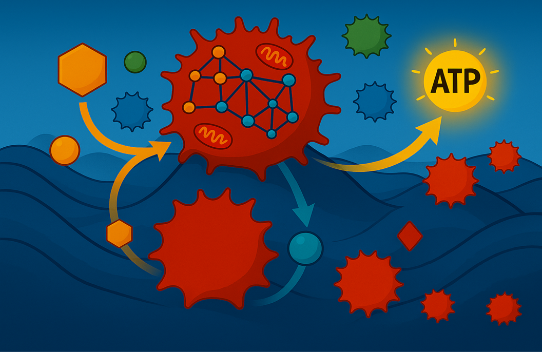 Issue 337: Cancer cells are like climbers navigating a rugged mountain range - they shift their footing and change course based on what is needed to survive and ultimately thrive. One source of this adaptability stems from cancer cell metabolic plasticity: a remarkable ability to mix and match energy-producing strategies and fuel sources such as glucose, fats, and amino acids. What governs these choices? It is a dynamic interplay between genetic circuits and internal biochemical pathways. As a result, cancer cells can traverse a landscape of possibilities, rolling from one 'valley' of stability to another - much like marbles drifting between dips in a hilly terrain, a concept echoed in the Waddington landscape of developmental biology. To stop cancer in its tracks, we must understand - and disrupt - not just where these cells are now, but where they are poised to go next. This art was generated with help from Sarah Groves and ChatGPT.
