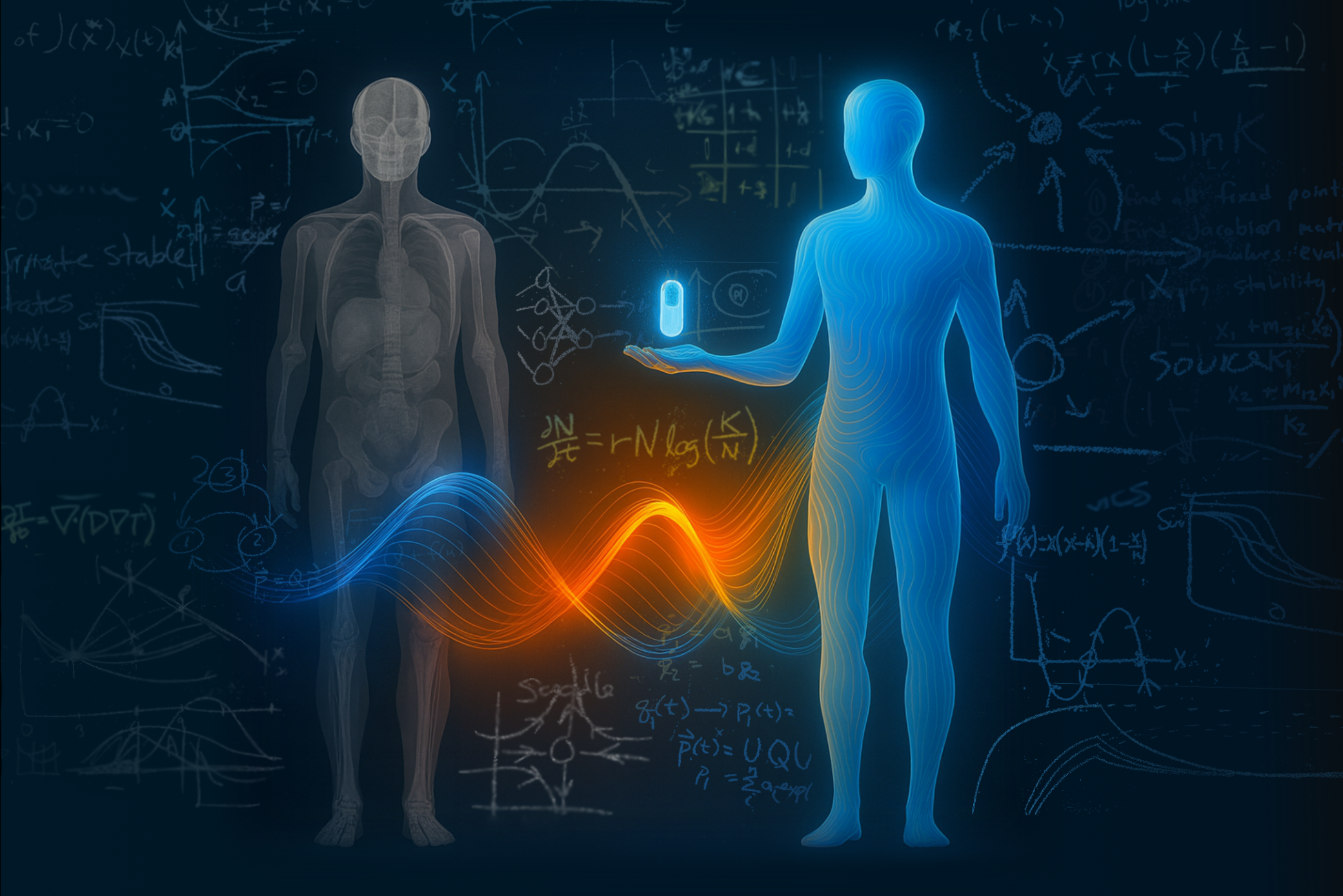 Issue 356: The widespread use of cytotoxic drugs has shaped the paradigm of uniformly administering a ‘maximum tolerated dose’ to patients; however, this approach fails to account for the dynamic and heterogeneous nature of challenging cancers. The cover image illustrates the translational capabilities of mathematical modeling to address these issues, transforming clinical patient information (depicted by the patient scan on the left) into digital avatars (shown by the blue wavy figure on the right) that enable personalized treatments (represented by the drug in the middle of the image). The underlying patient treatment and disease dynamics drive the digital representation, as indicated by the connecting waveforms between the two figures that emerge from the equations and mathematical analysis in the background.