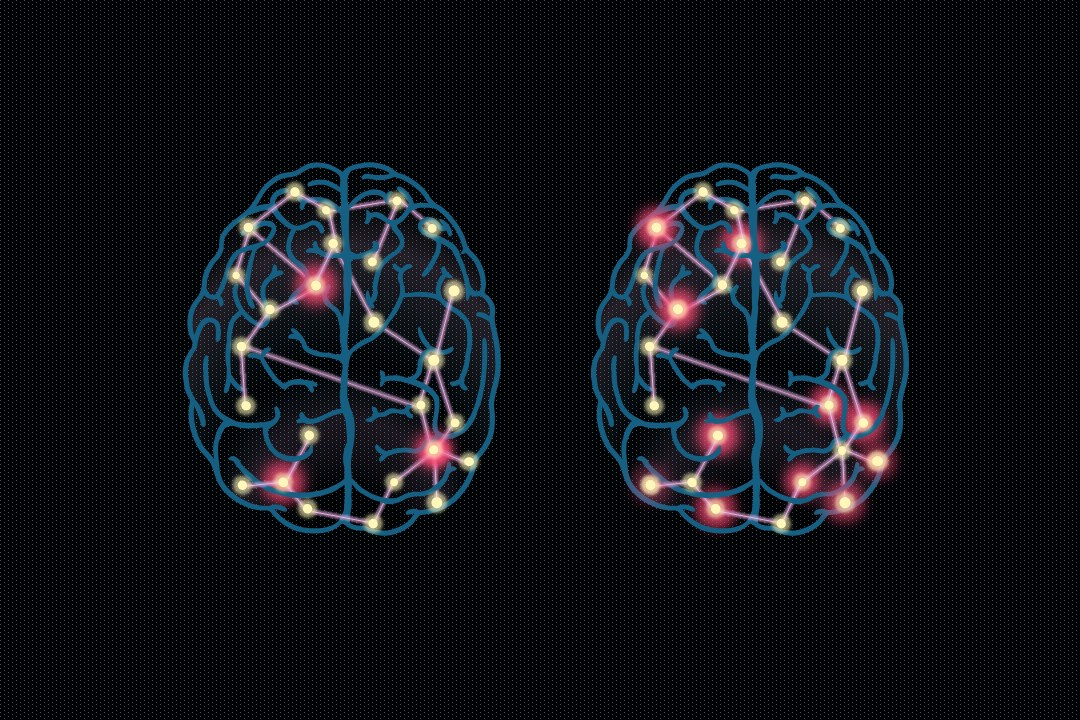 Issue 358: The image is showing an artistic representation of a glioblastoma calcium signalling network superposed on two brains. The yellow circles represent the glioblastoma cells and the pink lines represent the tumor microtubes that link cells together. The left image of the brain is showing the three cells initiating the calcium signal (represented by pink glow) and the right image is showing the signal propagation. The initiating cells in the left brain can be interpreted as periodic cells, which are cells that can initiate calcium transients in other cells. The artwork was created in Powerpoint with no external AI tools but did use a royalty free brain schematic as a guide for the brain outline.