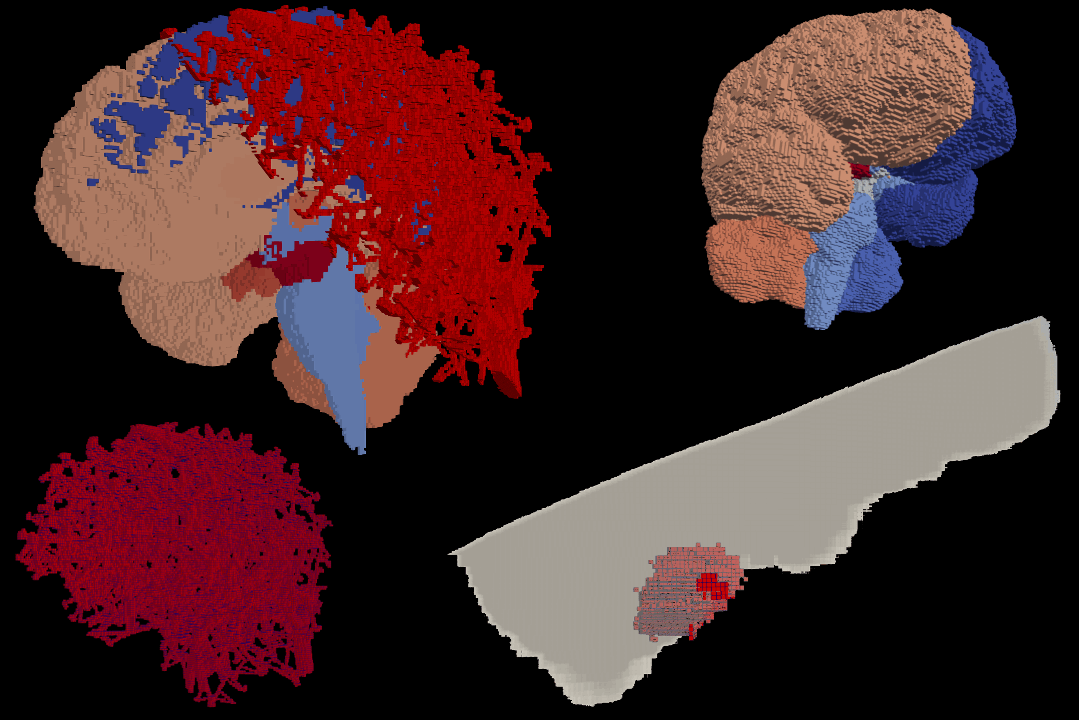 Issue 360: Radiotherapy is one of the most widely used cancer treatments, combining strong effectiveness with limited invasiveness. Thanks to decades of technological progress, treatments have become increasingly precise. Still, a small but meaningful number of patients develop long-term side effects. For people treated for brain or nasopharyngeal cancers, one of the most serious is brain necrosis, a form of tissue damage that can significantly affect cognitive function. Why does this happen to some patients but notothers who receive similar treatments? In our work, we use mathematical and computational models to explore this question. By simulating how necrosis can develop and spread in the brain under different conditions, we aim to better understand the sources of variability in patient response. Our model incorporates patient-specific features such as brain anatomy and vascular structure and uses them to generate realistic simulations of lesion growth over time. The images show these inputs alongside a simulatedexample of a progressing necrotic lesion. By helping explain why toxicity risk differs across patients, this modeling framework may ultimately support more personalized treatment strategies and contribute to reducing the incidence of radiation-induced brain injury.
