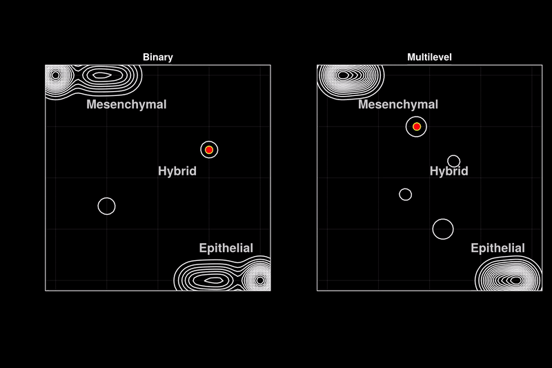 Issue 361: Hybrid epithelial-mesenchymal phenotypes have emerged as crucial components of cancer metastasis, as they enhance many pro-metastatic characteristics of cancer cells, including collective migration, stemness, and therapy resistance. A key characteristic of these hybrid phenotypes is the extensive heterogeneity in gene expression observed in cancer. The drivers, mechanisms, and implications of this heterogeneity for the stability of hybrid states remain highly debated. Using discrete models of gene regulatory networks, we show that stable hybrid states can be achieved through multiple stable expression levels across network genes, as opposed to the binary expression levels permitted in standard Boolean models. Multilevel models reveal that the network structure inherently supports stable hybrid states. While the relative abundance of hybrid phenotypes does not vary significantly in weakly stochastic environments expected in cell cultures or non-pathological conditions (blue ovals), stochastic environments expected in tumors and metastasis lead to a stable 'hybrid-cloud' in the multilevel model, allowing cells to retain the pro-metastatic hybrid phenotype while dynamically shifting their expression patterns (red dots with black trajectories). Thus, we propose stable intermediate expression levels as a mechanism underlying the heterogeneous expression patterns observed in hybrid E/M phenotypes, providing cancer cells with a dynamic survival strategy through metastasis.